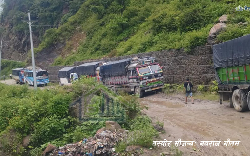 स्याउ बोकेका २० ट्रक कर्णाली राजमार्गमा अलपत्र