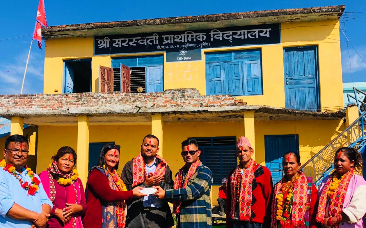 शर्माले विद्यालय अध्यक्ष भूमिसरा श्रेष्ठलाई एक लाख रुपैयाँको चेक हस्तान्तरण गरे। कार्यक्रममा वडा अध्यक्ष दिनेश खत्री, विद्यालय प्रमुख सुर्वणदेव गिरीलगायतको उपस्थिति थियो।
