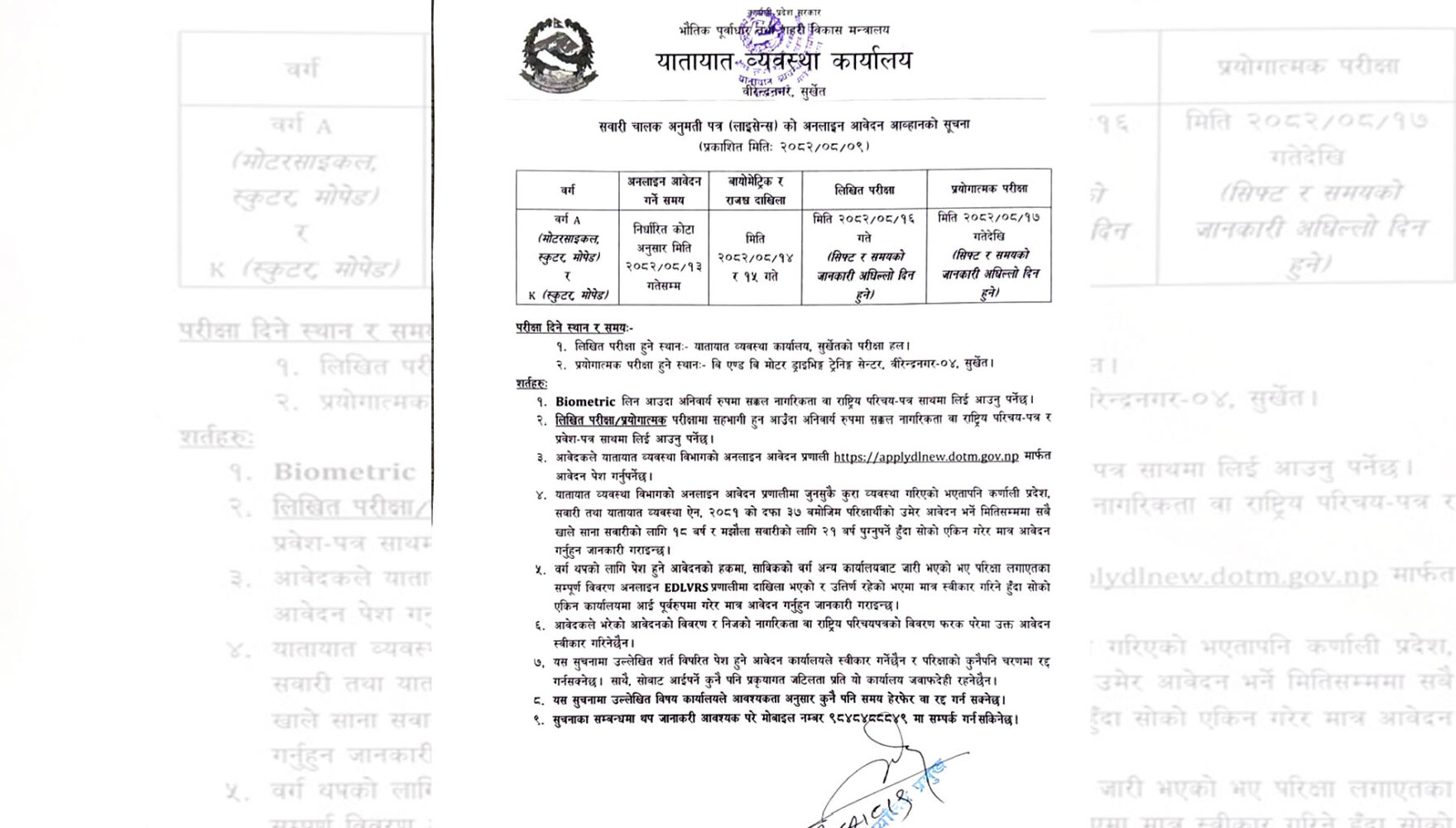 सवारी चालक अनुमति पत्र लिन चाहनेहरुले यही मंसिर १३ गतेसम्म अनलाइनबाट आवेदन दिइसक्नुपर्ने यातायात कार्यालयले जनाएको छ । आवेदकले मंसिर १४ गतेभित्र बायोमेट्रिक दर्ता तथा राजश्व बुझाइ सक्नुपर्ने छ । त्यस्तै १६ गते लिखित परीक्षा हुनेछ भने १७ गते प्रयोगात्मक परीक्षा हुने कार्यालयले जनाएको छ । तर तोकिएको समयमा अनुपस्थित भएका आवेदकको आवेदन स्वतः रद्द हुनेछ ।साना सवारीका लागि १८ वर्ष र मझ्यौला सवारीका लागि २१ वर्ष पूरा भएको हुनुपर्ने छ ।बायोमिट्रिक र लिखित परीक्षाका दिँदा आवेदकले नागरिकता, आवश्यक कागजात तथा फाराम अनिवार्य रूपमा साथमै बोक्नुपर्ने छ । लिखित परीक्षा रोलक्रम अनुसार याताया व्यवस्था कार्यालयमा र प्रयोगात्मक परीक्षा वीरेन्द्रगर–४ मा रहेको वि एण्ड वि मोटर ड्राइभिङ्ग ट्रेनिङ्ग सेन्टरमा हुने छ । यातायात व्यवस्था कार्यालय सुर्खेतका प्रमुख मुकुन्दनाथ याेगीले जानकारी दिए ।