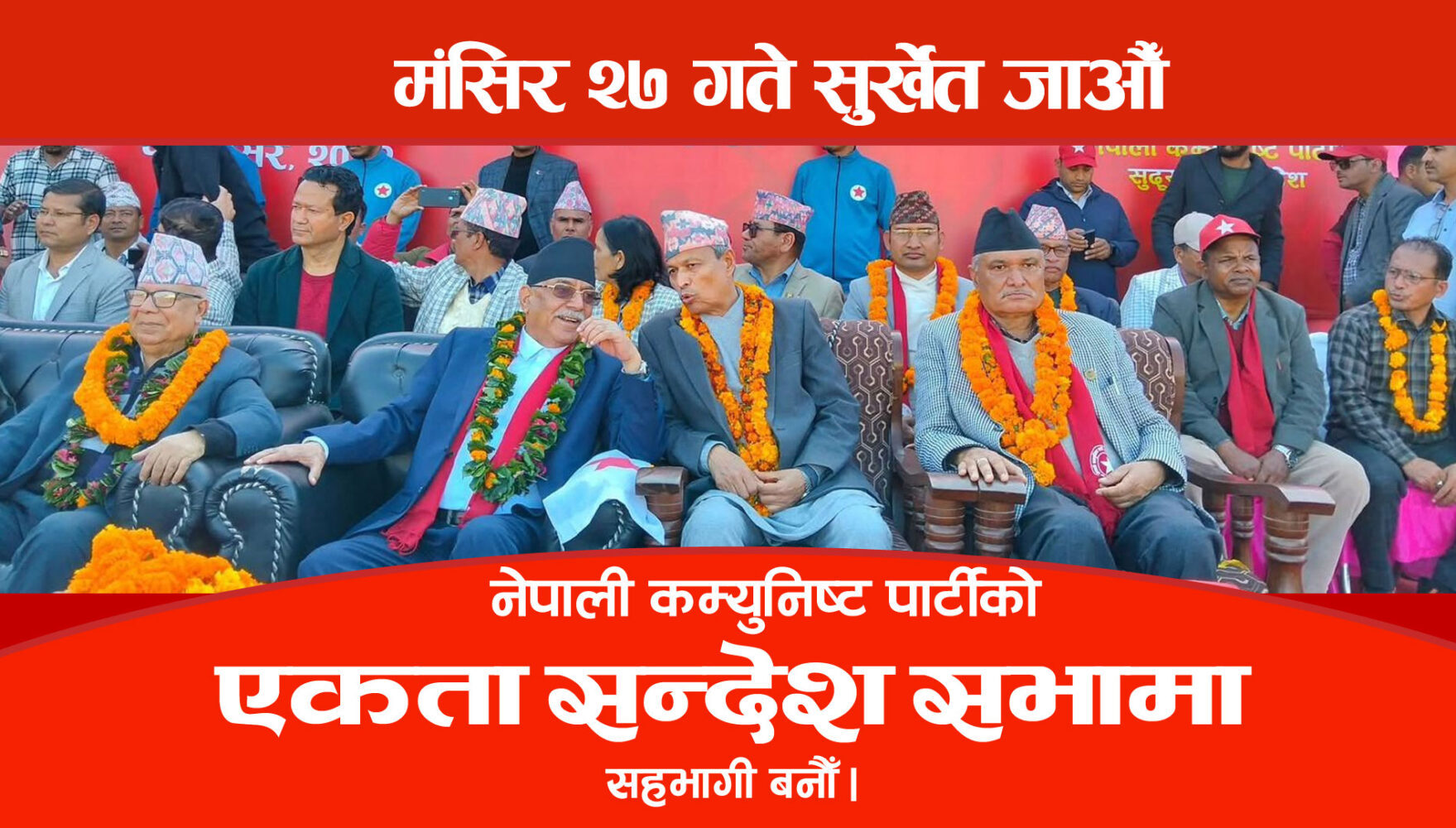 सुर्खेत । नेपाली कम्युनिष्ट पार्टी (नेकपा)ले यही मंसिर १८ गते सुर्खेतमा गर्ने भनिएको कर्णाली प्रदेशस्तरिय एकता सन्देशसभा मंसिर २७ गतेका लागि सारेको छ । मंसिर १८ गते परापूर्वकालदेखि चल्दै आएका पूर्णिमा तथा संस्कृति पर्वहरुका कारण २७ गतेका लागि सारिएको नेकपाले जनाएको छ । मंसिर पूणिमाको अवसरका कर्णालीका विभिन्न क्षेत्रमा पूर्णिमा मेला लाग्ने गर्दछ । पूर्णमा मेला तथा पर्वहरुमा असर पर्ने भएका कारण एकता सभालाई २७ गतेका लागि सारिएको नेकपाले जनाएको छ । विभिन्न १५ वटा दलहरु मिलेर बनेको नेकपाले कर्णालीमा पहिलो पटक एकता सभा गर्दै छ । एकता सभामा प्रदेशभरबाट ठूलो संख्याका नेता तथा कार्यकर्ताहरु उतार्ने नेकपाको तयारी छ ।