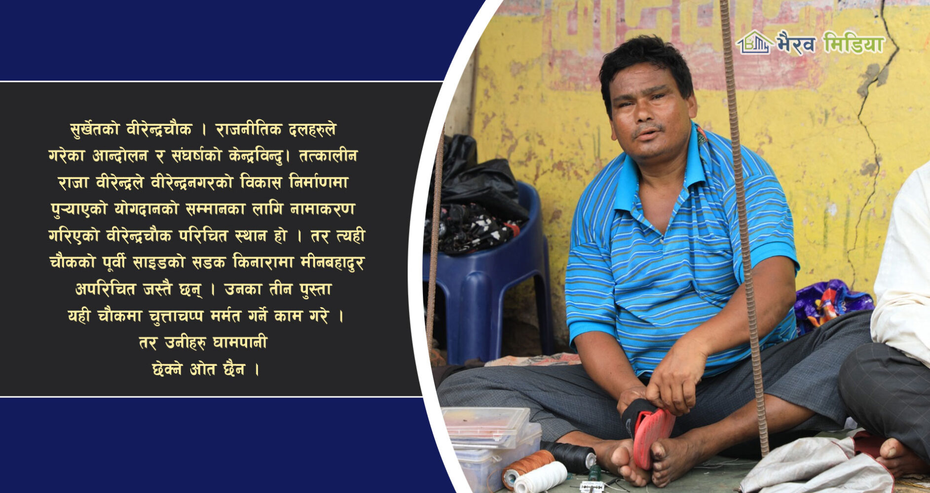 वीरेन्द्रनगर–४ भैरवस्थानका मिनबहादुर र उनका बुवा अहिले पनि वीरेन्द्रचौकमा जुत्ता चप्पल सिकाउने काम गर्छन् । विहानको दश नबज्दै वीरेन्द्रचौकमा आइपुग्ने उनी बेलुका घाम डुबेपछि मात्रै घर फर्किन्छन् । ‘मेरो बाजेले पनि यही पेशा गर्नुभएको थियो, बुवाले पनि यही पेशा गर्नुहुन्छ’ उनी भन्छन्, ‘म पनि १५/१६ वर्षदेखि यही पेशा गर्दै आएको छु ।’ तीन पुस्ताले नै जुत्ताचप्प सिलाउने काम गरेपनि घाम पानी छेक्कालाई ओत छैन । ‘जेठ बैशाखको चर्खाे गर्मी र बर्खे झरी हाम्रो लागि सामान्य जस्तै बनेको छ’ मिनबहादुर भन्छन्, ‘पुस/माघमा त सडक पेटीमा न्यानो नै हुन्छ तर घामपानी भने सहनै पर्छ । हावाहुरी आउँदा अर्काको सटरमा ओत लाग्ने उनी चर्काे घाम र बर्खे झरी भने छाताले नै छेक्ने गरेको बताउँछन् । सडक पेटी काम गर्दा आइपर्ने अनेक दुःखकष्टका कारण कहिलेकाँही उनी सोच्छन्, ‘स्थानीय र प्रदेश सरकारले हामीजस्ता विपन्न समुदायलाई ओत लाग्ने स्थानमा पेशा गर्ने व्यवस्था मिलाइदिए कति राम्रो हुँदो हो ?’समाज रुपमान्तरणका लागि भएका अनेक कालखण्ड भने देखे, भोगे । किनकि विकास र परिवर्तनका भएका सबै कालखण्डका आन्दोलनहरु वीरेन्द्रचौकमा केन्द्रित हुन्थे । कतिले गरिव र निमुखको सत्ता ल्याउने उद्घोष गरे, विकासको मुल फुटाउने सपना देखाए । तरः मिनबहादुर जस्ता भँइमान्छेका हक र अधिकारका विषयमा बोलिदिने कोही भएनन् ।