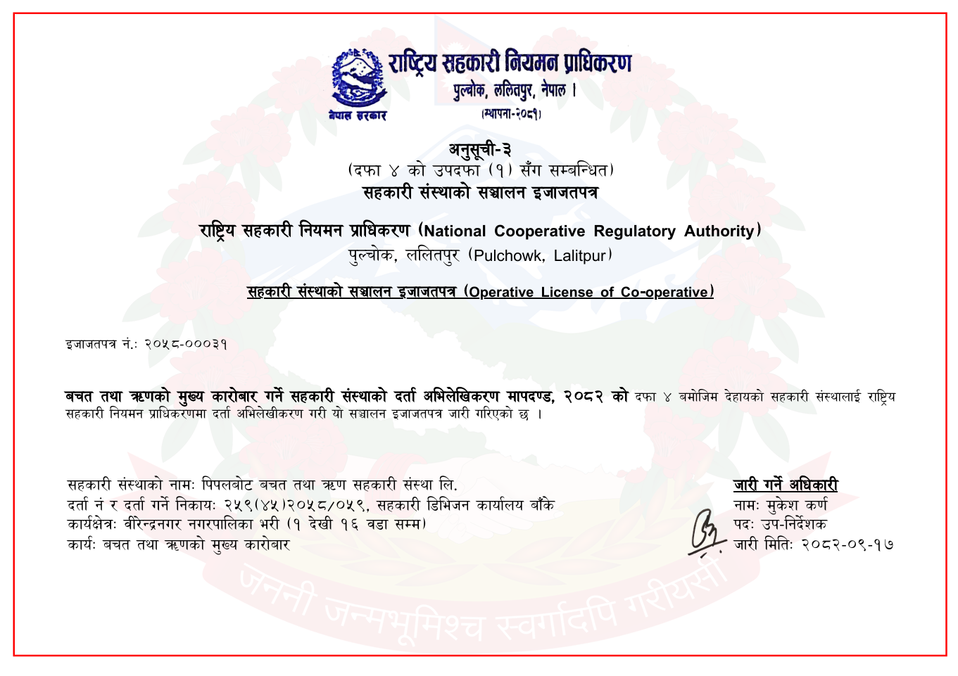 सुर्खेत। कर्णाली प्रदेश सुर्खेतको वीरेन्द्रनगर नगरपालिकामा रहेको कर्णाली प्रदेशकै अग्रणी संस्था पिपलबोट बचत तथा ऋण सहकारी संस्था लि।ले राष्ट्रिय सहकारी नियमन प्राधिकरण पुलचोक ललितपुरबाट संस्थाको मुख्य कारोवर बचत तथा ऋण सञ्चालनका लागि ईजाजत प्राप्त गरेकोछ ।बचत तथा ऋणको मुख्य कारोवार गर्ने सहकारी संस्थाको नियमन गरी सुशासन कायम गर्ने उद्देश्यले स्थापित राष्ट्रिय सहकारी नियमन प्राधिकरणले बचत तथा ऋणको मुख्य कारोवार गर्ने संस्थाहरुलाई २ महिनाको समय सिमा भित्र प्राधिकरणमा दर्ता हुन आह्यवन गरेको थियो सोही अनुसार पिपलबोट बचत तथा ऋण सहकारी संस्थाले राष्ट्रिय सहकारी नियमन प्राधिकरणबाट बचत तथा ऋणको मुख्य कारोवार गर्न अनुमति पाएको हो ।