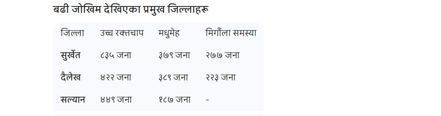 सुर्खेत । कर्णाली प्रदेश सरकारले सञ्चालन गरेको ‘नागरिक स्वास्थ्य परीक्षण’ कार्यक्रमले प्रदेशमा नसर्ने रोगहरूको जोखिम तीव्र रूपमा बढ्दै गएको चिन्ताजनक तथ्य सार्वजनिक गरेको छ। सामाजिक विकास मन्त्रालयले आठ जिल्लाका २२ हजार ७ सय ५१ जनामा गरेको परीक्षणमा ११ प्रतिशत (२,५३६ जना) मा उच्च रक्तचाप, ६ प्रतिशतमा मधुमेह र ३ प्रतिशतमा मिर्गौला सम्बन्धी समस्या देखिएको हो।