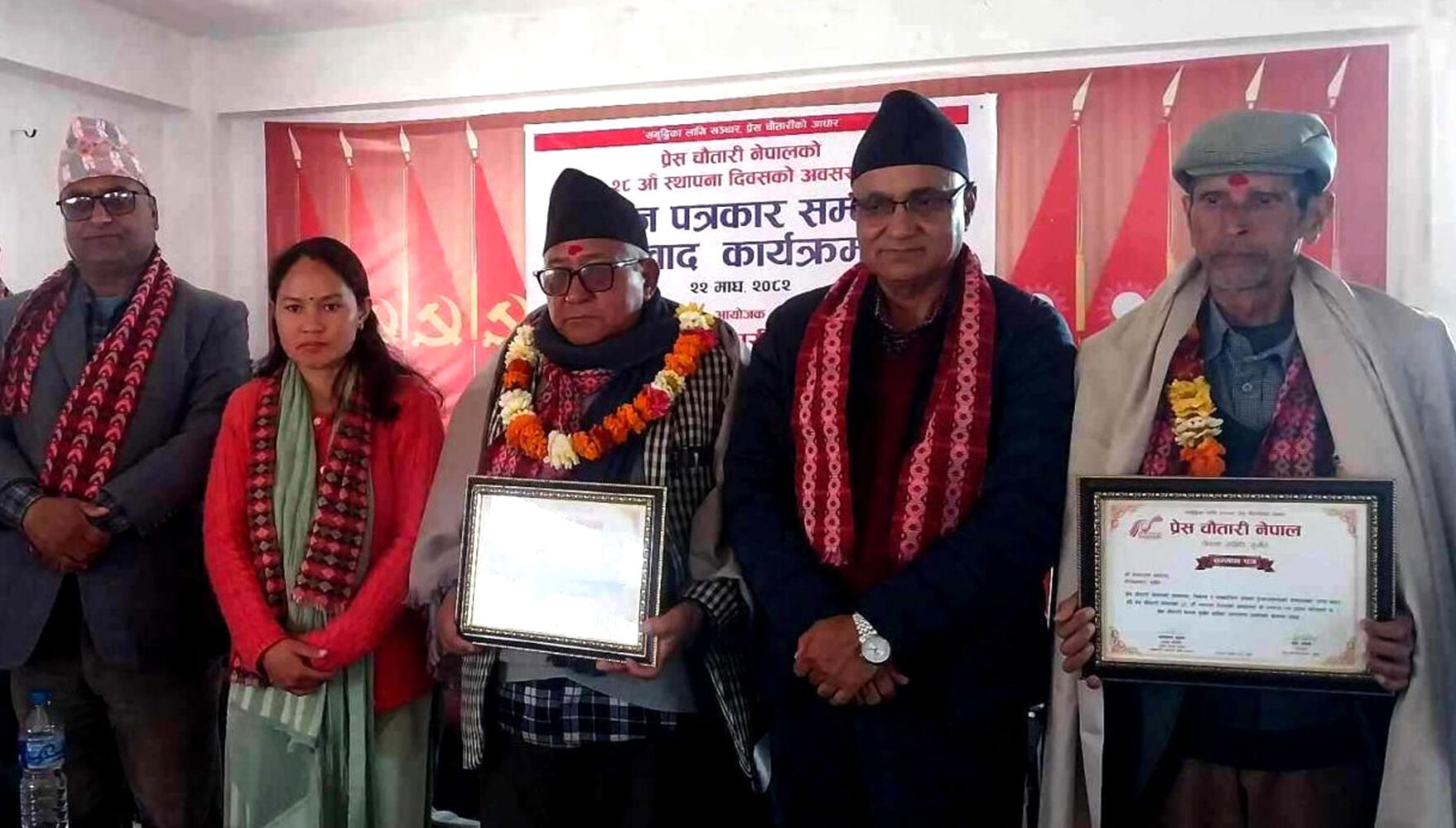 सुर्खेत । प्रेस चौतारी नेपाल सुर्खेत शाखाले आफ्नो २८ औँ स्थापना दिवसको अवसरमा आज वीरेन्द्रनगरमा एक विशेष कार्यक्रम गरी पाँच जना अग्रज पत्रकारहरूलाई सम्मान गरेको छ। सम्मानित हुनेहरूमा प्रेस स्वतन्त्रता सेनानी बालाराम शर्मासहित वरिष्ठ पत्रकारहरू पृथ्वीबहादुर सिंह, खडानन्द कँडेल, डा. दीपक गौतम र सूर्यमणि गौतम छन्। मुख्यमन्त्री यामलाल कँडेलले उनीहरूलाई खादा र प्रमाणपत्रसहित सम्मान गर्दै पत्रकारिता क्षेत्रले नागरिकको भरोसा जित्नुपर्नेमा जोड दिए।