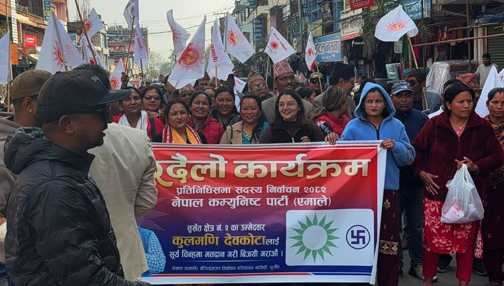 सुर्खेत । प्रतिनिधिसभा निर्वाचन नजिकिएसँगै नेकपा एमालेले सुर्खेतमा मतदाता भेटघाट र घरदैलो अभियानलाई निकै तीव्रता दिएको छ। यसैक्रममा मंगलबार वीरेन्द्रनगर नगरपालिकाको वडा नम्बर ३ र ६ का विभिन्न टोलहरूमा एमालेका उम्मेदवार र नेताहरूले उत्साहजनक घरदैलो गरेका छन्।