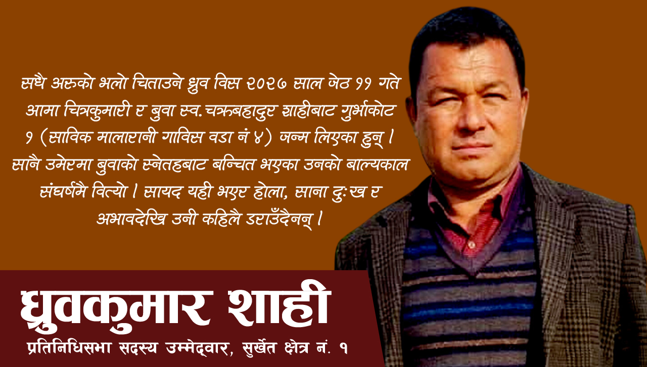 यसपालि फेरि उनै ध्रुवलाइ सुर्खेतको पूर्व भागमा चम्किने अवसर मिलेको छ । किनकि आसन्न प्रतिनिधिसभा सदस्यको निर्वाचनमा नेकपा एमालेबाट उनी सुर्खेत क्षेत्र नं. १ को उम्मेद्वार छन् । सदाबहार प्रतिस्पर्धी नेपाली कांग्रेसका पूर्णले मैदान छोडेका कारण हो कि किन हो कुन्नी यसपालि भने ध्रुव निकै हौसिएका छन् ।