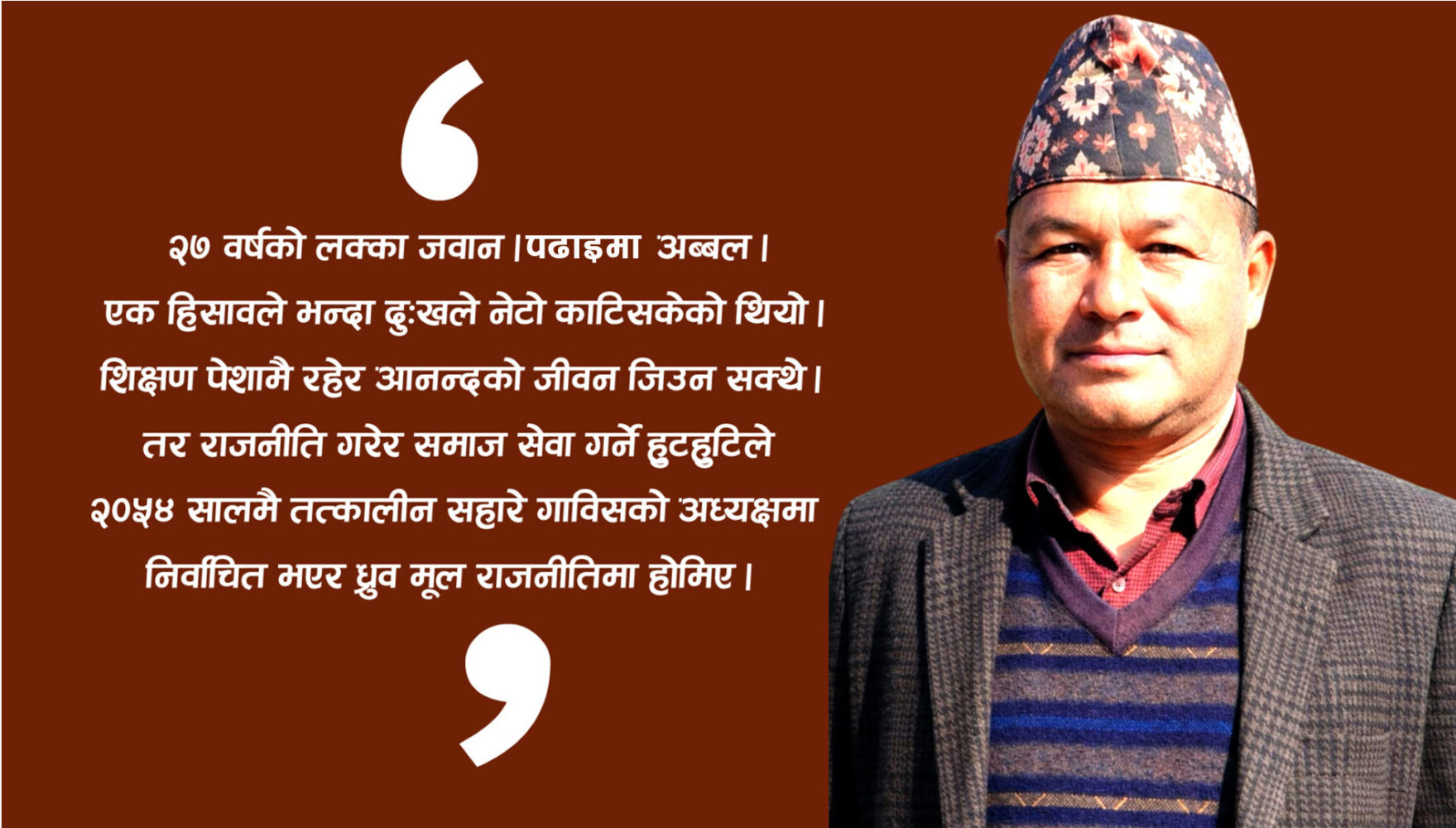 २७ वर्षको लक्का जवान । पढाइमा अब्बल । शिक्षण पेशाको अनुभव । एक हिसावले भन्दा दुःखले नेटो काटिसकेको थियो । शिक्षण पेशालाई नै निरन्तरता दिएर आनन्दको जीवन जिउन पाउने अवसर थियो । तर राजनीति गरेर समाज सेवा गर्ने हुटहुटिले ध्रुवकुमार शाहीलाई मूल राजनीतिमा डोहोयायो । उज्जवल भविष्यको सपना त्यागेर उनी आजभन्दा तीन दशकअघि अर्थात २०५४ सालमा मूल राजनीतिमा हाम फाले । संयोग भन्यौँ वा भाग्य पहिलो पटकमै ध्रुव चम्कीए अर्थात तत्कालीन सहारे गाविसको अध्यक्षमा निर्वाचित भए ।