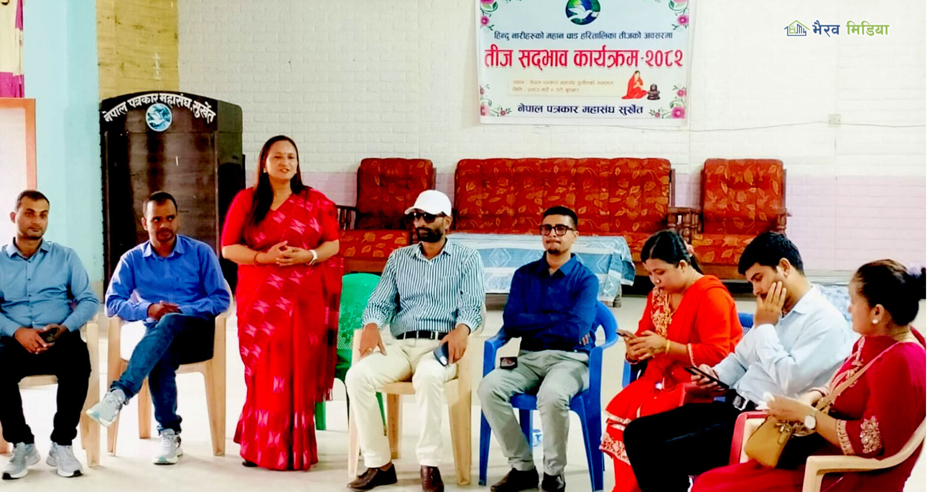 यसै अवसरमा सुर्खेतमा क्रियाशिल पत्रकारहरु महिलाहरुलाई पनि तीज लागेको छ । नेपाल पत्रकार महासंघ सुर्खेत शाखाले तीज सद्भावना कार्यक्रम नै गरेर दर खुवाएको छ ।
