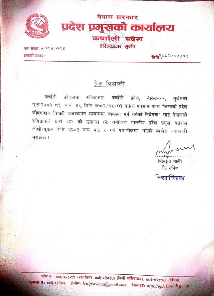 प्रदेशसभा सचिवालको पत्रानुसार बिहिबार प्रदेश प्रमुख यज्ञराज जोशीले ‘कर्णाली प्रदेश जीवनाशक विषादी व्यवस्थापन सम्बन्धमा व्यवस्था गर्न बनेको विधेयक’लाई नेपालको संविधानको धारा २०१ को उपधारा (२) बमोजिम प्रदेश प्रमुख जोशीले प्रमाणीकरण गरेका हुन् ।अर्गानिक प्रदेशको अवधारणालाई पुरा गर्न प्रदेश सरकारले यो विधेयक संसदमा लगेको थियो । विधेयक प्रमाणीकरण भएसँगै कर्णालीमा जीवनाशक विषादी प्रयोगमा कडाई गरिने छ ।