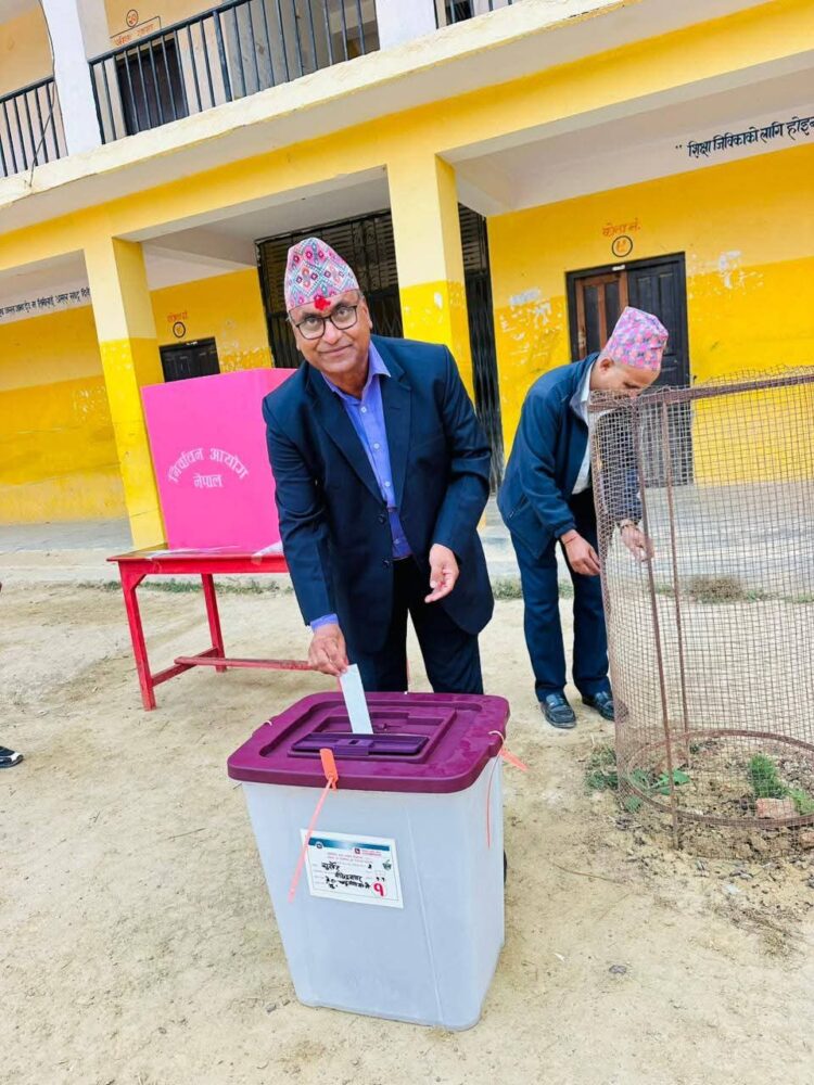 वीरेन्द्रनगर ११ गाग्रेतालमा रहेकाे चन्द्रगंगा माध्यमिक विद्यालयकाे (क) मतदान केन्द्रबाट पहिलो मत हालेका हुन् ।