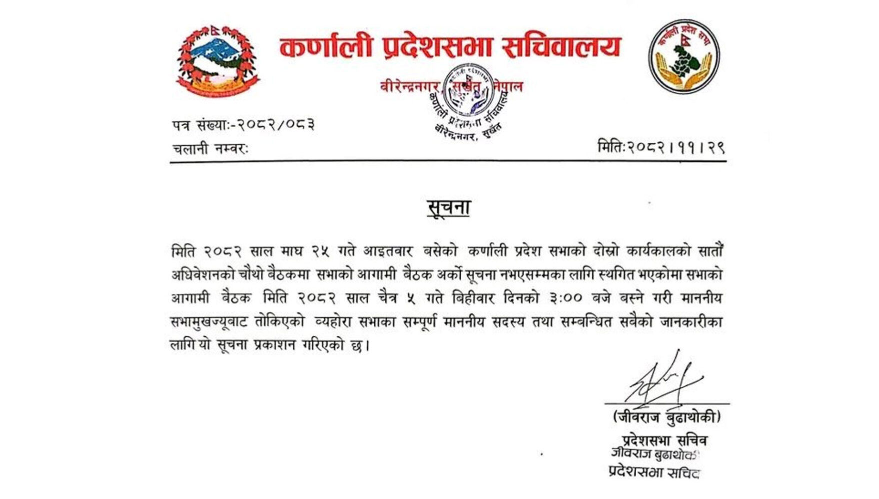 प्रदेश सभा सचिव जीवराज बुढाथोकीले जारी गरेको सूचना अनुसार, दोस्रो कार्यकालको सातौँ अधिवेशन अन्तर्गतको पाँचौँ बैठक आगामी चैत ५ गते बिहीबार दिनको ठ्याक्कै ३:०० बजे बस्ने गरी तय गरिएको छ।