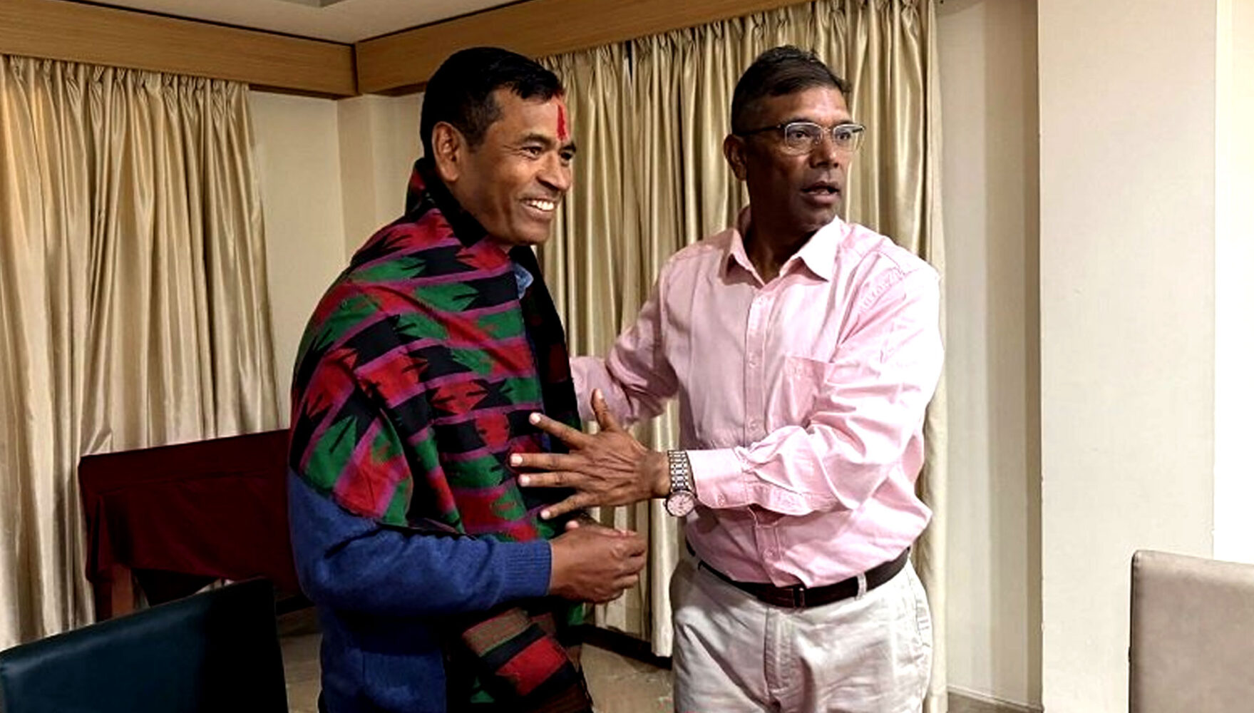 कालीकोटबाट प्रतिनिधिसभा सदस्यमा नवनिर्वाचित कर्णालीका संस्थापक मुख्यमन्त्री महेन्द्रबहादुर शाहीलाई बधाइदिँदै कर्णालीका पूर्व मुख्यमन्त्री जीवन बहादुर शाही ।