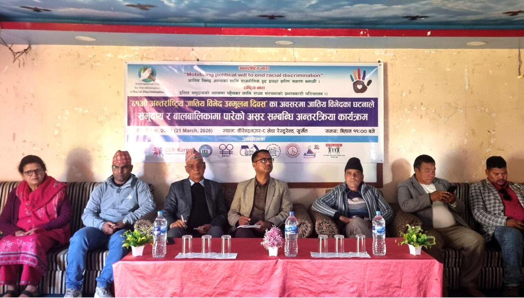 सुर्खेत । ‘दलित समुदायको न्यायमा पहुँचका लागि राज्य संरचनाको प्रभावकारी परिचालन’ भन्ने मूल नाराका साथ कर्णाली प्रदेशमा ६१औँ अन्तर्राष्ट्रिय जातीय विभेद उन्मूलन दिवस मनाइएको छ। सुर्खेतको वीरेन्द्रनगर र पञ्चपुरी लगायतका क्षेत्रमा आयोजित अन्तरक्रिया तथा सांस्कृतिक कार्यक्रमहरूले एउटा तीतो यथार्थलाई फेरि सतहमा ल्याइदिएका छन्— नेपालको संविधानले जातका आधारमा हुने विभेदलाई अपराध माने पनि कर्णालीको सामाजिक व्यवहारमा यो अझै ‘जिवितै’ छ।