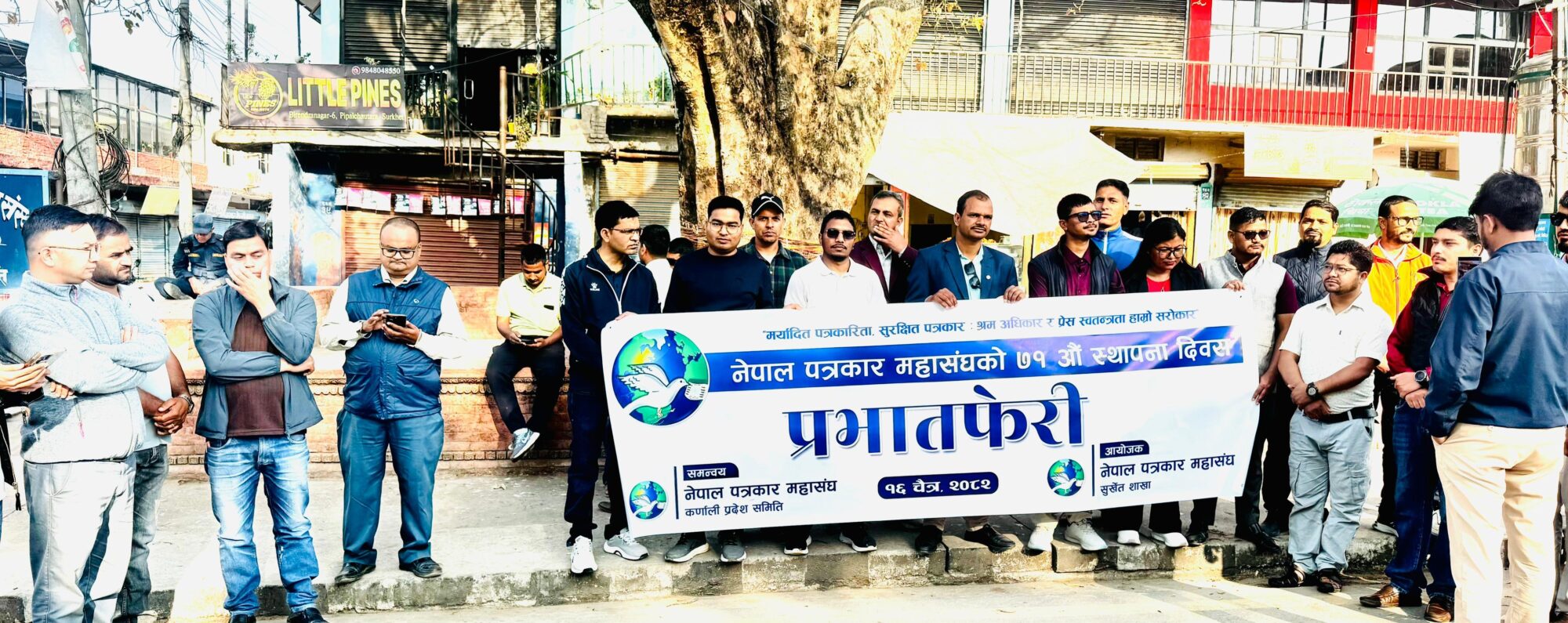 प्रभातफेरी कार्यक्रम नेपाल पत्रकार महासंघ सुर्खेत शाखाकाे अायाेजना र महासंघ कर्णाली प्रदेशकाे समन्वय भएकाे हाे ।