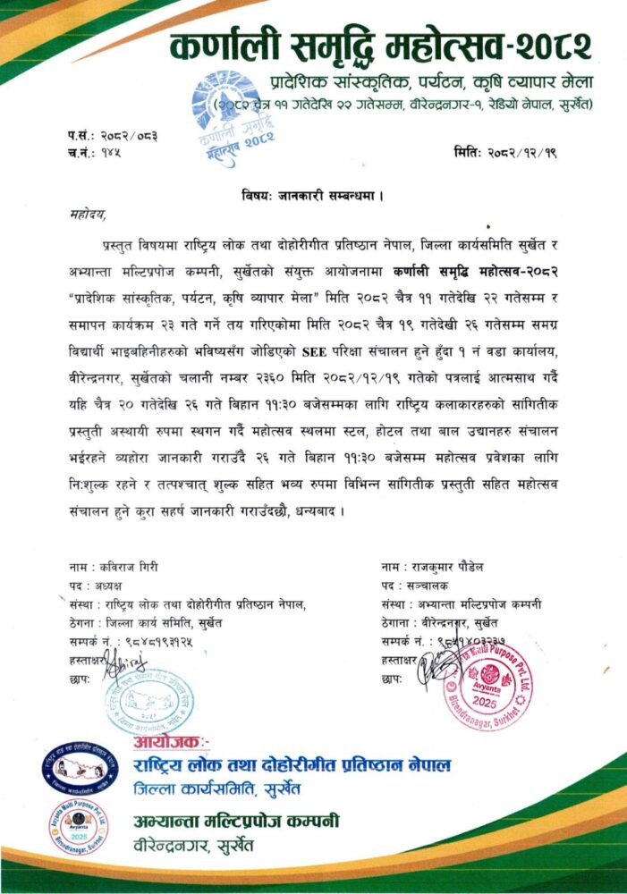 सुर्खेत । वीरेन्द्रनगरमा हर्षोल्लासका साथ सञ्चालन भइरहेको ‘कर्णाली समृद्धि महोत्सव-२०८२’ ले विद्यार्थीहरूको भविष्यसँग जोडिएको माध्यमिक शिक्षा परीक्षा (एसईई) लाई मध्यनजर गर्दै एक प्रशंसनीय निर्णय लिएको छ। राष्ट्रिय लोक तथा दोहोरी गीत प्रतिष्ठान नेपाल, जिल्ला कार्यसमिति सुर्खेत र अभ्यान्ता मल्टिप्रपोज कम्पनीको संयुक्त आयोजनामा भइरहेको यस महोत्सवले भोलि चैत्र २० गतेदेखि चैत्र २६ गते बिहान ११:३० बजेसम्मका लागि आफ्ना सम्पूर्ण साङ्गीतिक प्रस्तुतिहरू स्थगित गर्ने घोषणा गरेको हो। महोत्सव आयोजक समितिका अध्यक्ष कविराज गिरी र सञ्चालक राजकुमार पौडेलद्वारा जारी विज्ञप्ति अनुसार, परीक्षा अवधिलाई शान्त र मर्यादित बनाउन तथा विद्यार्थीहरूको एकाग्रतामा सघाउ पुर्याउन यो कदम चालिएको हो।