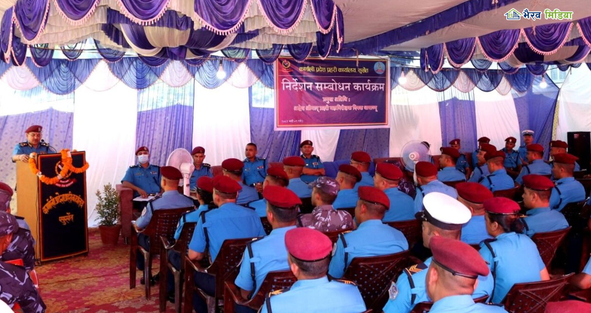 सुर्खेत । नेपाल प्रहरीका महानिरीक्षक (आईजीपी) दिपक थापाले कर्णाली प्रदेश मातहातका प्रहरी कर्मचारीलाई प्रदेशको समग्र शान्ति सुरक्षा बलियो बनाउन र विपद् प्रतिकार्यको योजना सहित अगाडि बढ्न निर्देशन दिएका छन् । सोमबार कर्णाली प्रदेश प्रहरी कार्यालय सुर्खेतमा आयोजित निर्देशन सम्बोधन कार्यक्रममा बोल्दै प्रहरी महानिरीक्षक थापाले यस्तो निर्देशन दिएका हुन् ।