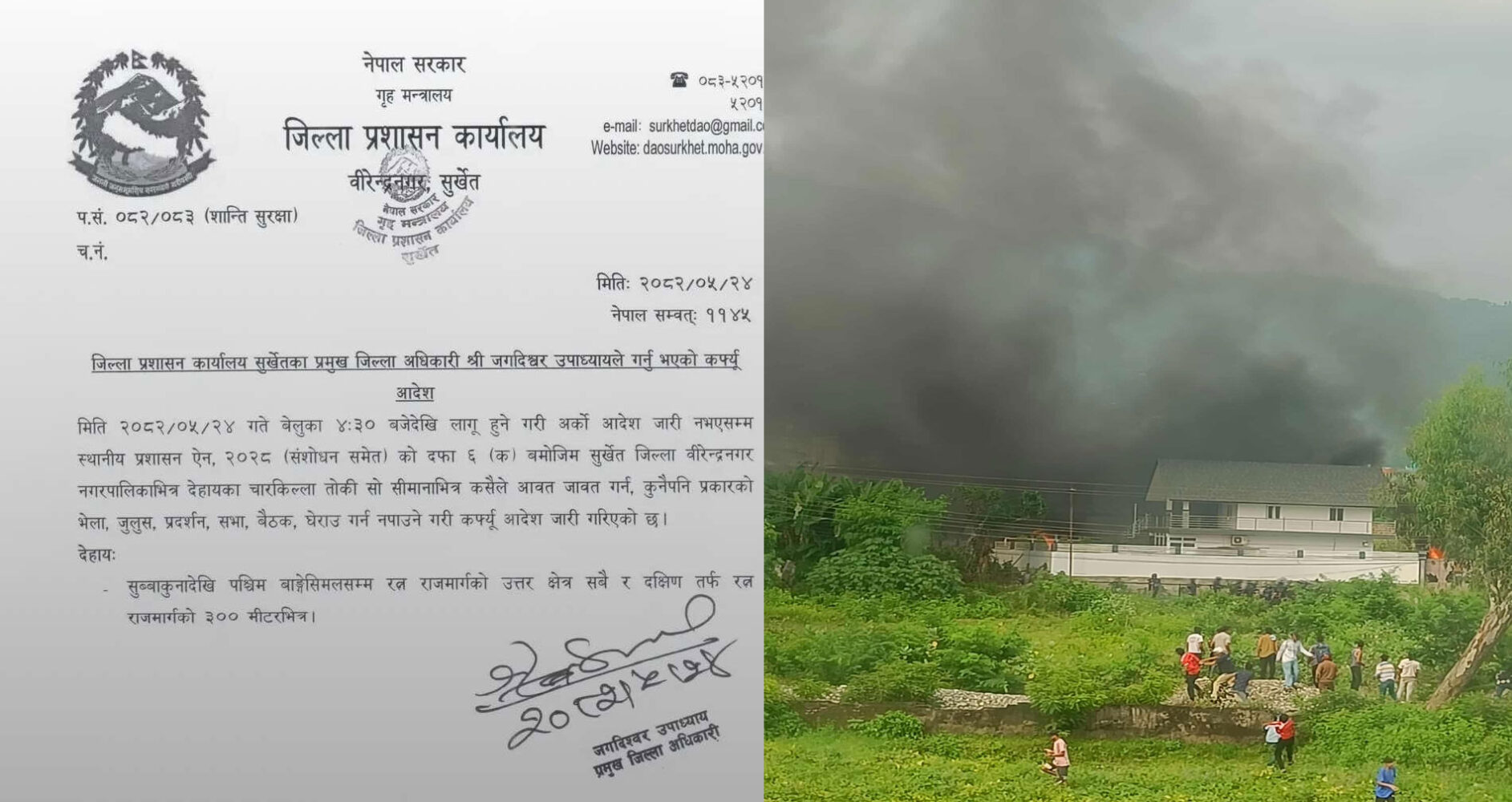सुर्खेत । जेनजीहरुको आन्दोलत्र उग्र बनेपछि सुर्खेतमा पनि आज (मंगलबार)देखि कफ्र्यूृ लगाइएको छ । जिल्ला प्रशासन कार्यालय सुर्खेतले अहिले दिउँसो साढे ४ बजेदेखि अर्काे निर्णय नभएसम्म कफ्र्यु लगाइएको हो । प्रशासनले सुर्खेतको वीरेन्द्रनगरस्थित सुब्बाकुनादेखि पश्चिम बाङ्गेसिमलसम्म रत्न राजमार्गको उत्तर क्षेत्र सबै र दक्षिण तर्फ रत्न राजमार्गको ३०० मीटरभित्र कफ्र्यु लगाइएको हो । सुर्खेतका प्रमुख जिल्ला अधिकारी जगदिश्वर उपाध्यायले सूचना जारी गर्दै कफ्र्यु लगाइएको जानकारी दिए ।